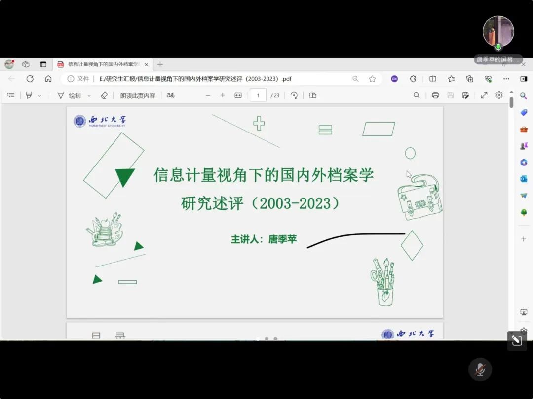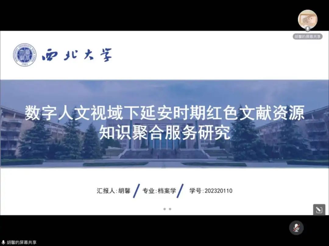 2023级档案学专业研究生胡馨汇报的题目是《数字人文视域下延安时期红色文献资源知识聚合服务研究》,当前延安时期红色文献资源面临资源分散、文献老化、利用率低等诸多挑战,如何深层次挖掘和利用延安时期红色文献资源是学界关注的新问题,该研究以数字人文为研究视角,对这一问题进行探索,分析延安时期红色文献资源开发的必要性,梳理现有研究,明确知识聚合服务的现实路径,设计并阐述延安时期红色文献资源知识聚合模式,最后以杨家岭相关红色文献资源为例,进行实证性研究。