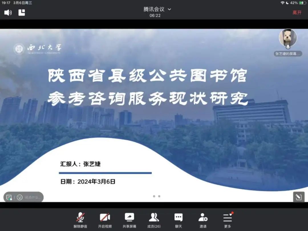 2021级图书馆学专业研究生张艺婕汇报的论文题目为《陕西省县级公共图书馆参考咨询服务现状研究》,汇报主要围绕研究背景、参考咨询服务的定义与内容、陕西省县级公共图书馆参考咨询服务的现状与存在问题展开,针对问题提出服务平台、人才队伍、宣传推广、评价反馈几个方面的提升策略。