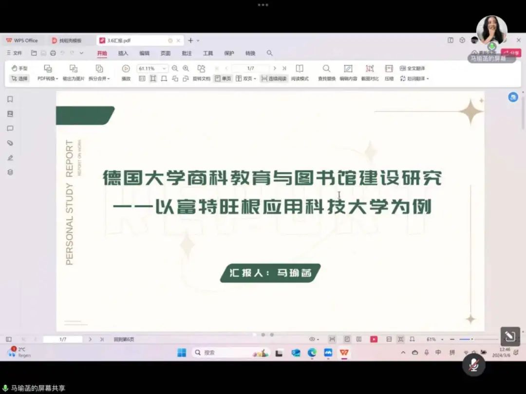 2022级图书馆学专业研究生马瑜菡汇报的题目是《德国大学商科教育与图书馆建设研究——以HFU富特旺根应用科技大学为例》,从德国商科教育概况与德国大学图书馆建设两方面的进行了分享,主要分为四个方面:德国高等教育概况、学习氛围、图书馆建设情况以及课程学习。在图书馆建设情况方面,该图书馆面积不大,纸质馆藏与课程相关度较高,整体馆藏以数字馆藏为主。并且该图书馆使用企业制作的资源平台统一进行资源管理和咨询发布,职能丰富。整体来说节省人力物力便于管理,但同时也有应急能力差,效率较低的局限性。