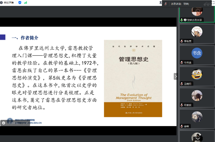 徐咪博士对其汇报做出点评,她首先肯定了贺妍同学汇报的逻辑性,指出她从文化和历史的角度对管理思想史的整个发展脉络进行了系统梳理,回顾了很多代表性的管理大师的主要思想观点。其次,徐咪博士讲述了自己对管理思想史这本书的看法,她指出雷恩这一版本的管理思想史的分析视角不同于其他版本,它不是单纯地从历史角度来进行分析,而是结合了很多文化还有历史的背景进行阐述的,使我们对许多熟悉的理论和著名管理学家产生了全新的认识和理解。徐咪博士还指出作为学习公共管理的学生,我们可以回归本质,围绕这本书重新思考管理到底是什么?