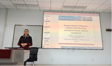 王淑珍教授讲述的题目为《今天消费还是为明天储蓄:个体跨期决策的认知神经机制》。王淑珍教授系统的介绍了课题组的三个研究方向:包括行为决策(金钱相关的决策和道德决策),人力资源相关研究,基于行为公共管理的研究。其中,详细介绍了与金钱相关的跨期决策,使用Go/NoGo范式结合神经科学测量跨期选择中自控能力与贫困因素的关系。