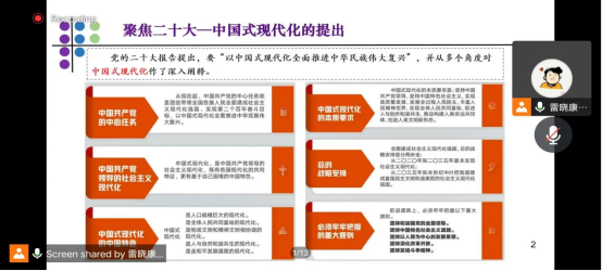 2022年10月19日,西北大学565net必赢雷晓康教授通过腾讯会议为全体研究生作了题为“市域社会治理现代化问题研究”的线上专题讲座。
